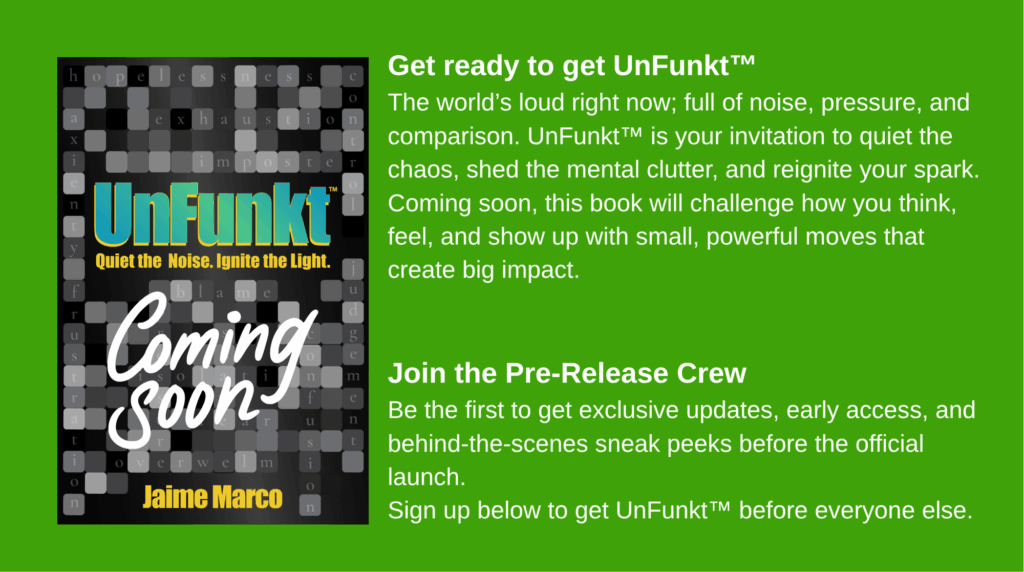 Jaime Marco created Get UnFunkt™ as both a movement and a methodology to help individuals and teams break free from burnout, misalignment, and autopilot living. Through her high-energy keynotes, workshops, and coaching, Jaime empowers people to see that leadership isn’t a title—it’s an attitude.